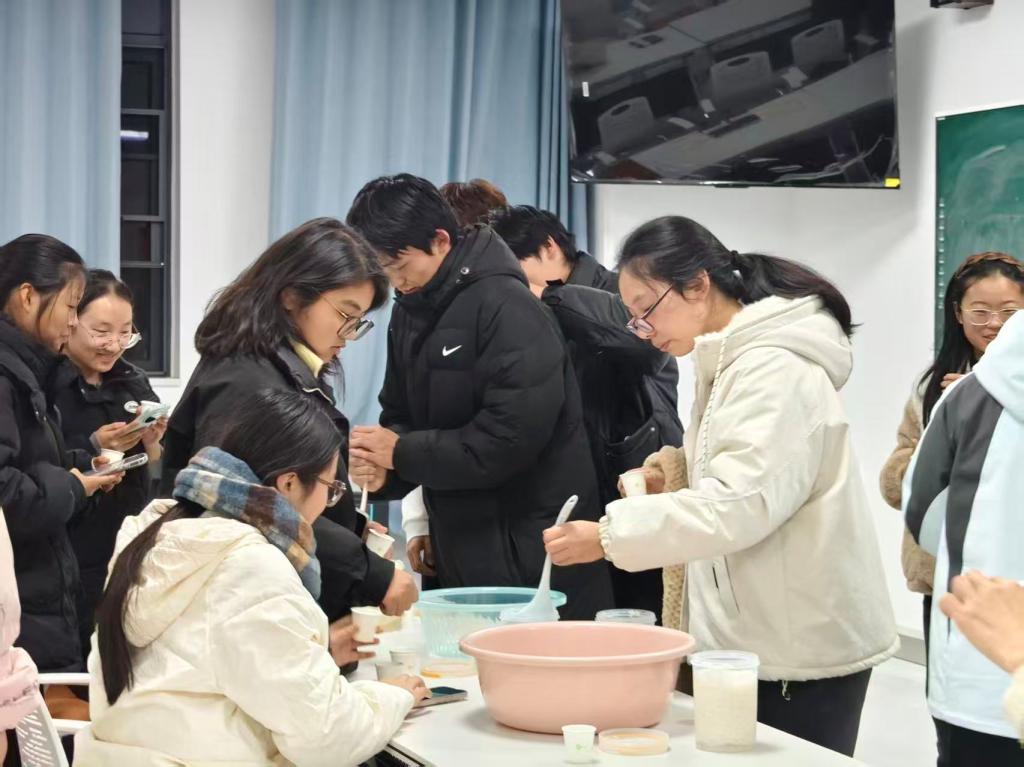 从文献查阅、试验设计、实施试验、过程观察、结果记录、数据分析、实践总结到成果汇报展示等各个环节,工作坊的同学们分组协作,展开工作。在试验中,糯米经过淘洗、浸泡和蒸煮后变得晶莹清香,冷凉后的熟糯米分别与含有不同浓度酒曲的水和红枣水相遇,在30摄氏度的环境下进行着生命体的繁衍和物质的转化。隔日后,同学们对发酵结束的成果进行指标测试和感官品鉴,并在生命科学学院敏思楼A1-204教室,各组长以PPT形式对本小组的实践成果向师生们进行了汇报分享。最后,赵昕梅老师对本次实践活动进行了点评总结。本次活动,得到了同学们的积极认可。同学们纷纷表示,这样的活动不仅有趣,而且从中锻炼了动手能力和解决问题的能力,并对生物科学专业的学科素养有了进一步的理解和认知。