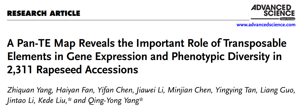 近日,我校生命科学学院与华中农业大学、崖州湾国家实验室等多单位联合在国际知名期刊Advanced Science(IF5 year:15.6)杂志上在线发表题为A pan-TE map reveals the important role of transposable elements in gene expression and phenotypic diversity in 2,311 rapeseed accessions的研究论文。该研究通过整合14个生态型代表性的油菜高质量基因组与来自全球2,311份油菜种质资源的大规模多组学数据,从基因组非编码区域的角度,全面系统地刻画了油菜转座子的组成、分布和变异规律,构建了全球首张油菜“泛转座子图谱”(pan-TE map),并深入揭示转座子在调控基因表达、驱动表型变异以及促进育种改良中的核心作用,为作物分子设计育种提供了全新的资源体系和理论基础。我校生命科学学院樊海燕博士为共同第一作者,植物营养与逆境生物学团队负责人李金涛副教授也参与了该研究工作。